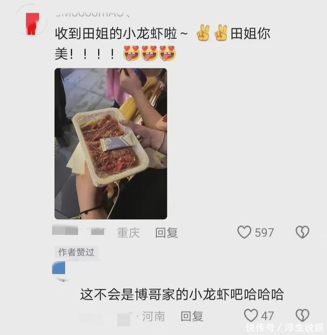 田姐在重庆的时辰,方博给田姐送了四盒小龙虾,田姐没吃完,剩下两盒送给球迷了,还跟他们说小龙虾很可口,吃的合计好了可以找方博,田姐对方博真够意旨道理。昨晚方博在直播间里对田姐说,让她下单小龙虾撑持一下,田姐二话没说就又下单了,是竟然撑持方博。话说就冲田姐给方博送跑车,方博是不是多给田姐送几盒,田姐直播时辰还让人人去关怀方博,东谈主竟然很好。